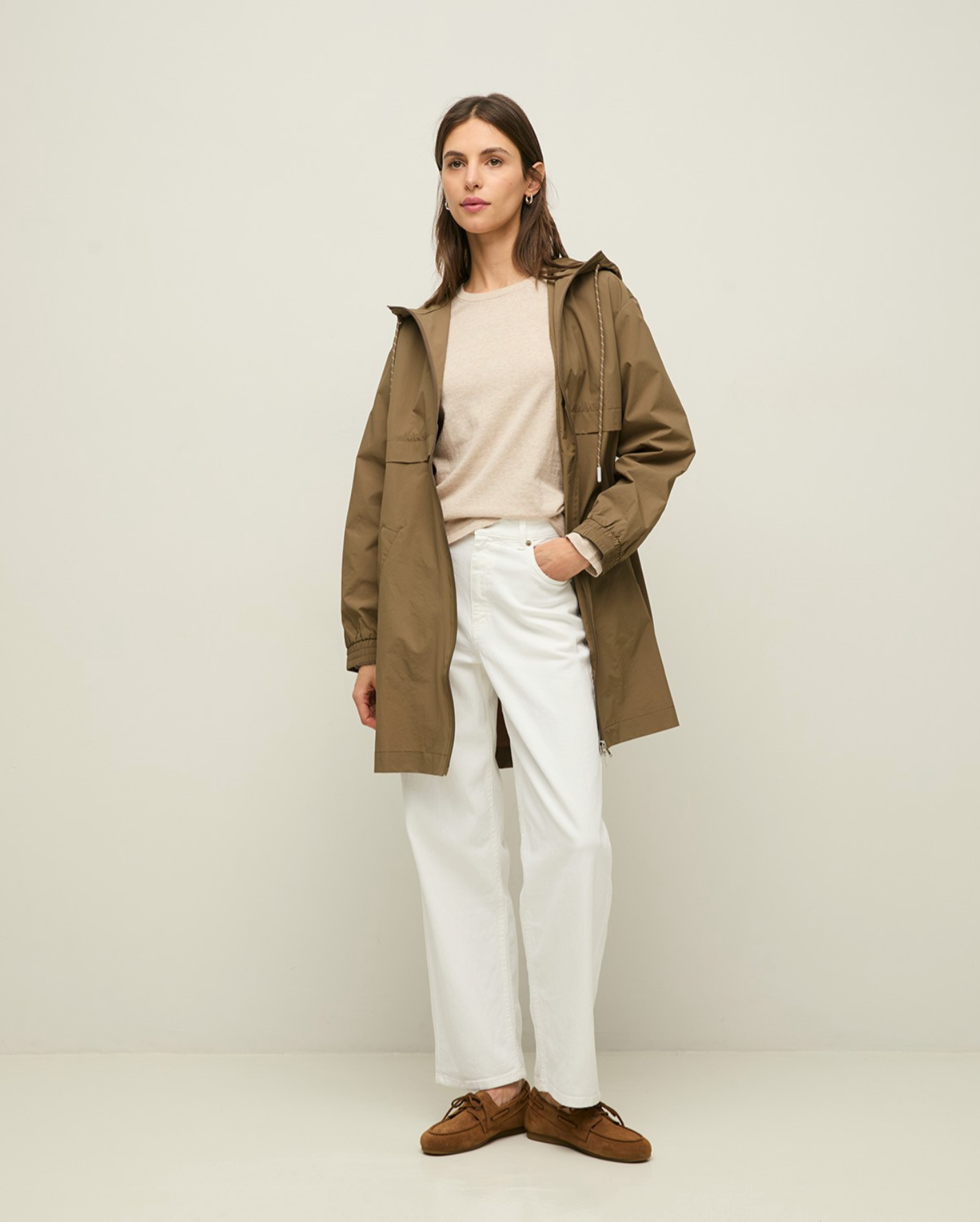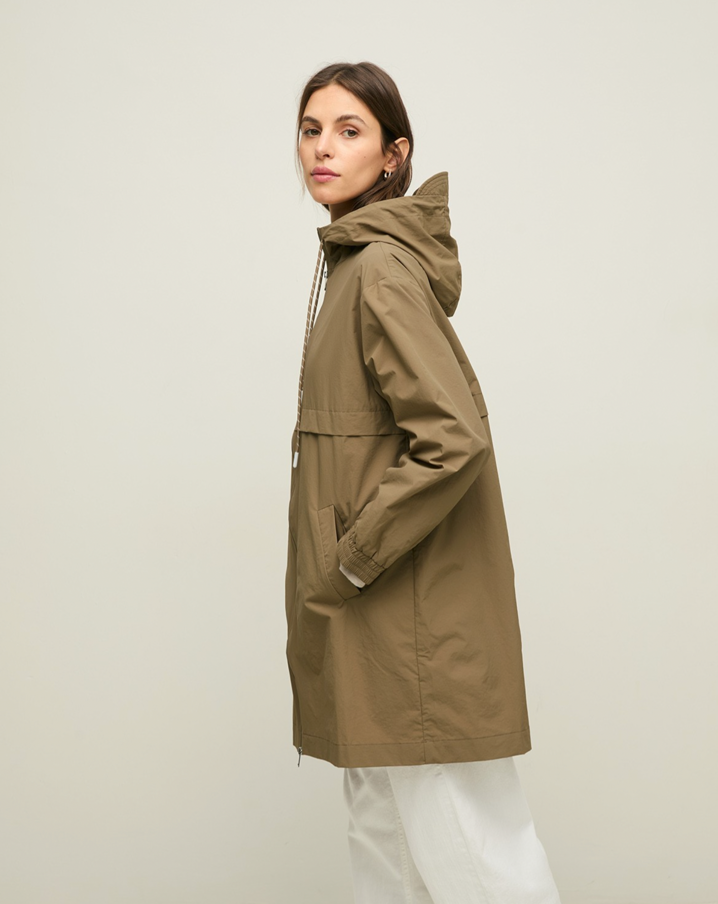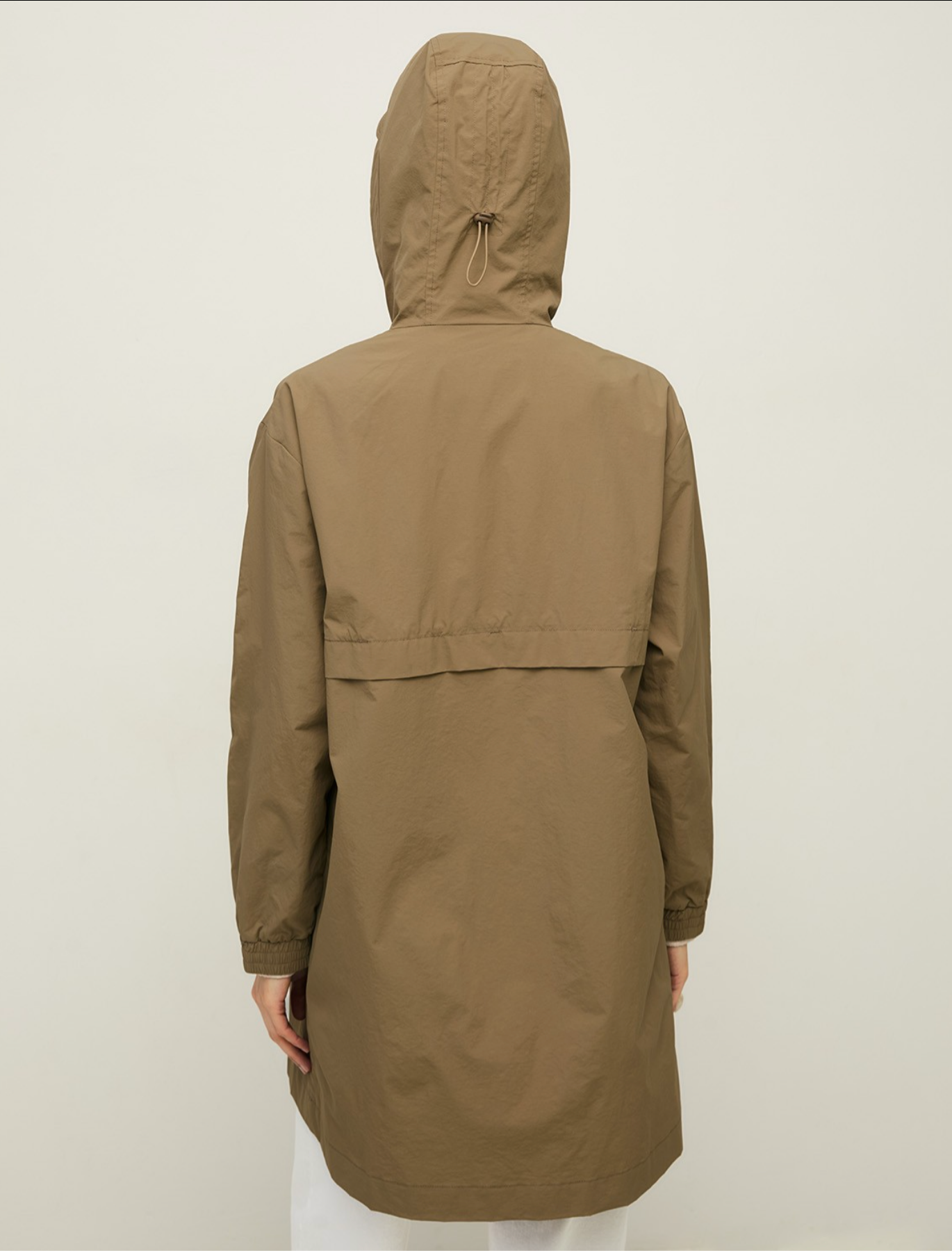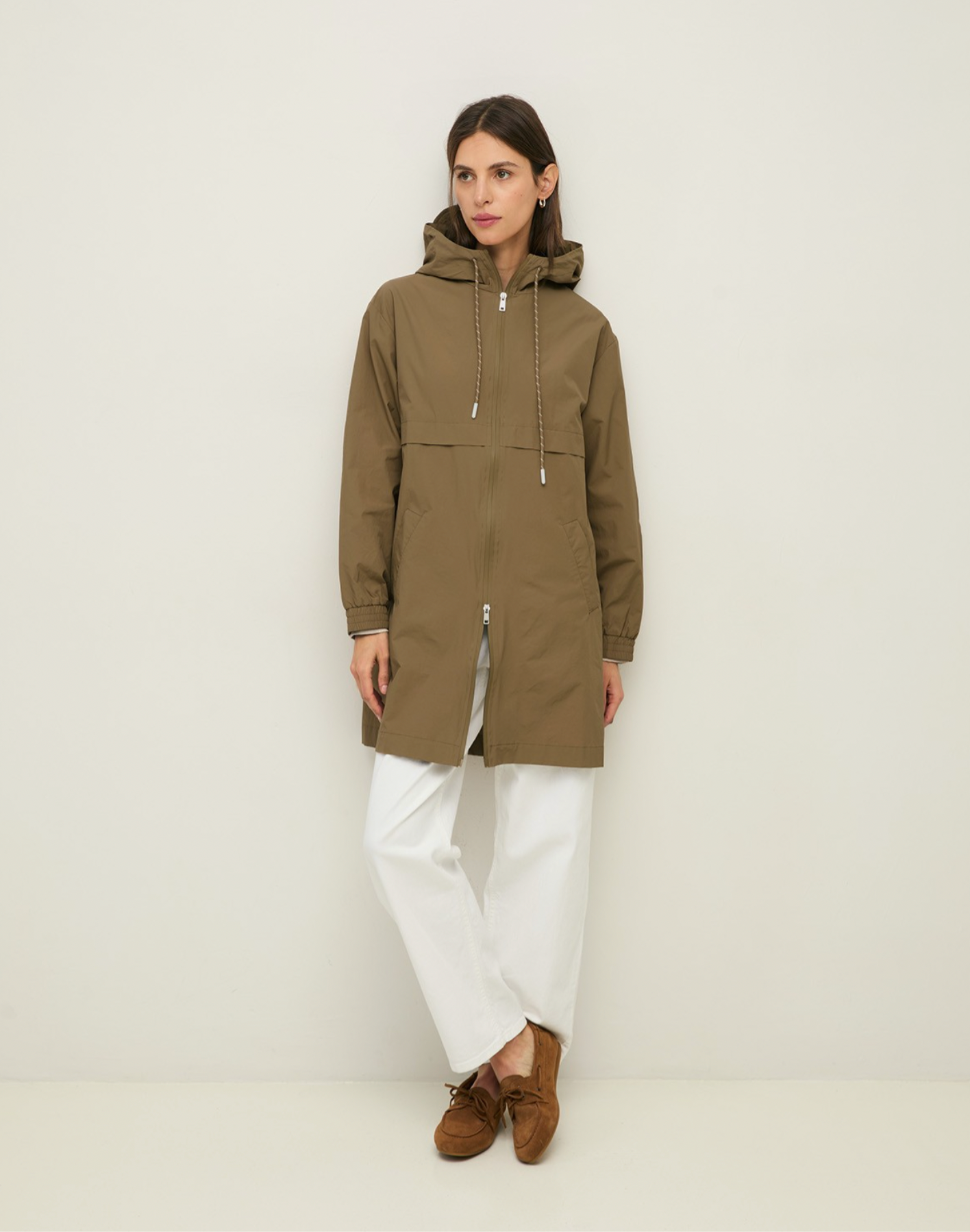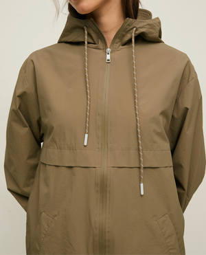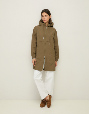 Sportlicher Parka, in leichtes Nylongewebe mit wasserabweisender Beschichtung. Zwei-Wege-Reißverschluss vorne. Kapuze mit Schirm, Futter und Kordelzug. Elastische Bündchen. Zwei Vordertaschen.