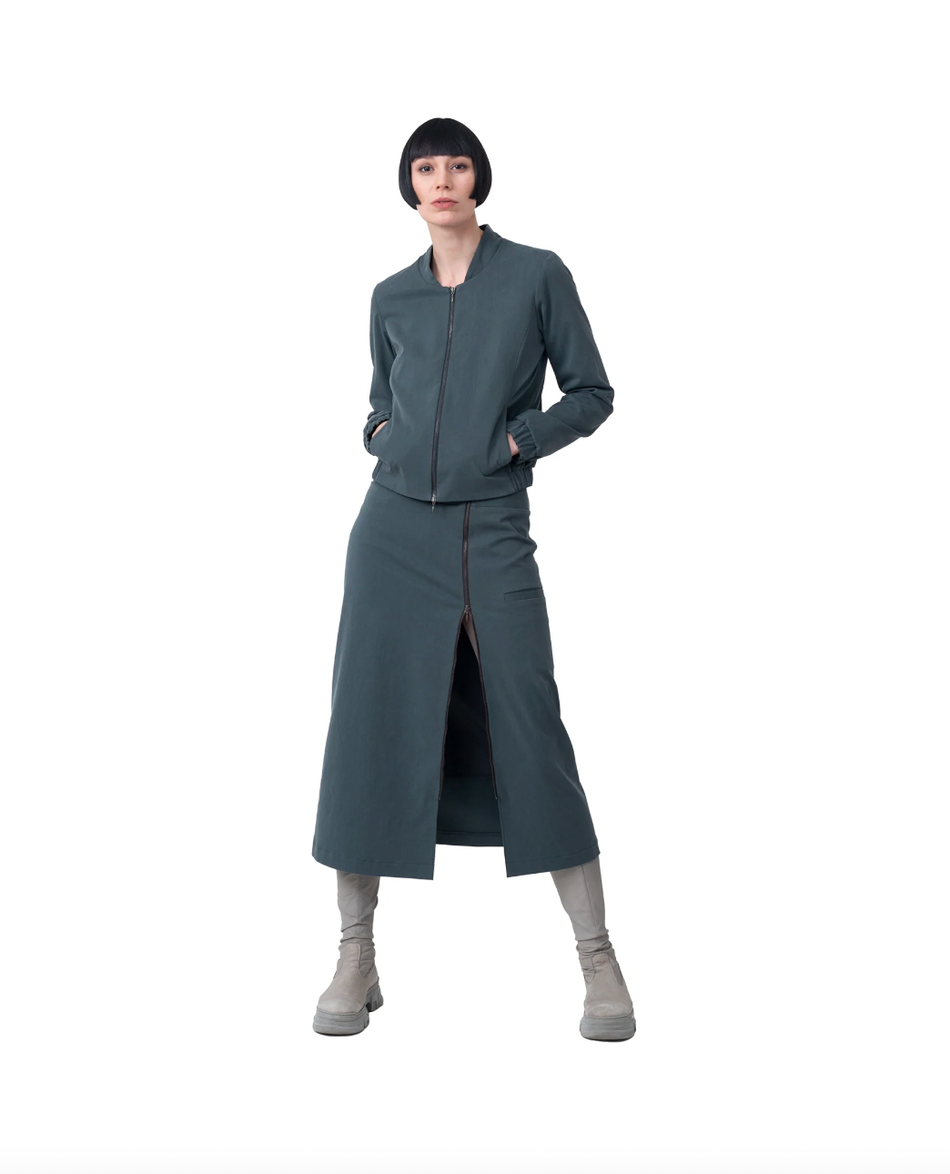 Langer Rock aus GOTS-zertifiziertem Lyocell-Cotton in Olivgrün – stilvoll, bequem und nachhaltig. Das besondere Detail: der durchgehende Reißverschluss im Vorderteil, der sich von oben und unten öffnen lässt und so für mehr Bewegungsfreiheit und variable Styles sorgt.